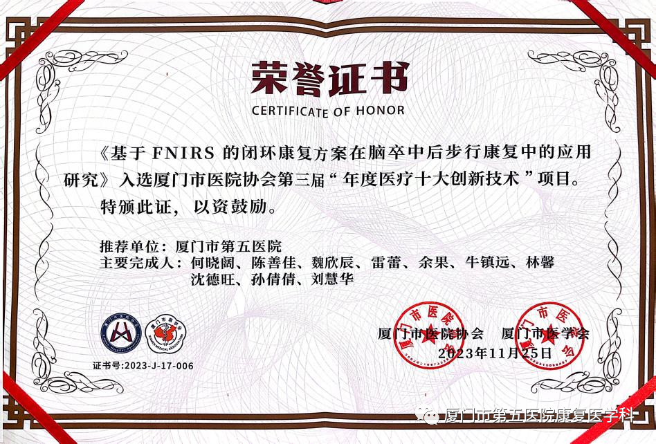 康复再获殊荣:厦门市年度医疗十大创新技术奖