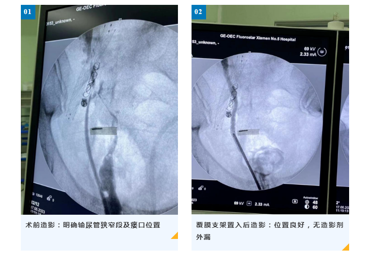 40岁的陈先生患有直肠、盲肠肿瘤,多次就诊不同的九州娱乐app ,五年多来做了不下五次腹部手术,其中包括结肠造瘘,一次因出血行髂动脉覆膜支架置入及髂动脉分支栓塞。因其疾病的特殊性合并右侧输尿管损伤、输尿管直肠瘘、输尿管腹壁瘘,患者肛门口及腹部伤口有尿液渗出,生活质量大打折扣。近日,陈先生转诊至九州娱乐app-九州app下载 (厦门大学附属第一九州娱乐app 翔安院区)泌尿外科,主任医师许丽明专家团队为患者行输尿管探查,发现患者右侧输尿管黏连、弹性差、合并狭窄,手术处理起来难度极大。许丽明专家团队根据陈先生的病情,与厦门大学附属第一九州娱乐app 泌尿外科主任医师陈跃东一起为患者量身定制了一套科学合理的治疗方案——放置输尿管覆膜支架。手术首先使用造影剂为患者定位输尿管损伤处及狭窄段,找到输尿管瘘口。接着,用球囊扩张狭窄段,并置入覆膜支架,最后再次注入造影剂,造影显示输尿管覆膜支架位置良好、造影剂无外渗,支架成功封堵瘘口并覆盖狭窄段。手术顺利完