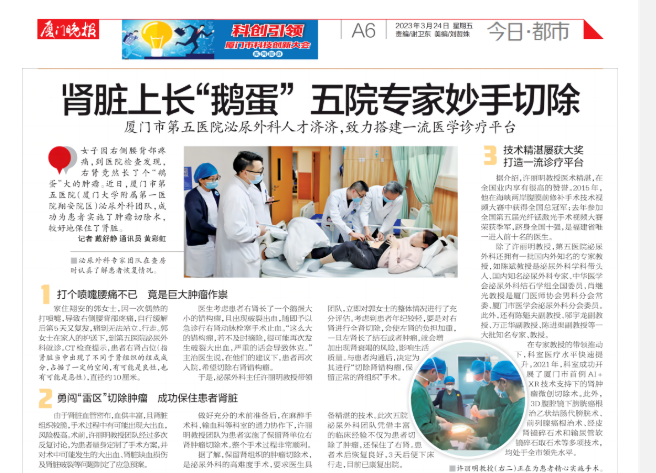 肾脏上长“鹅蛋” 五院专家妙手切除九州娱乐app-九州app下载 泌尿外科人才济济,致力搭建一流医学诊疗平台2023-03-24 来源:厦门晚报记者 戴舒静 通讯员 黄彩虹女子因右侧腰背部疼痛,到九州娱乐app 检查发现,右肾竟然长了个“鹅蛋”大的肿瘤。近日,九州娱乐app-九州app下载 (厦门大学附属第一九州娱乐app 翔安院区)泌尿外科团队,成功为患者实施了肿瘤切除术,较好地保住了肾脏。打个喷嚏腰痛不已竟是巨大肿瘤作祟家住翔安的郭女士,因一次偶然的打喷嚏,导致右侧腰背部疼痛,自行缓解后第5天又复发,痛到无法站立、行走。郭女士在家人的护送下,到第五九州娱乐app 泌尿外科就诊。CT检查提示,患者右肾占位(指肾脏当中出现了不同于肾组织的组成成分,占据了一定的空间,有可能是良性,也有可能是恶性),直径约10厘米。医生考虑患者右肾长了一个鹅蛋大小的错构瘤,且出现破裂出血,随即予以急诊行右肾动脉栓塞手术止血。“这么大的错构瘤,若不及时摘除,很可能再次发生破裂大出