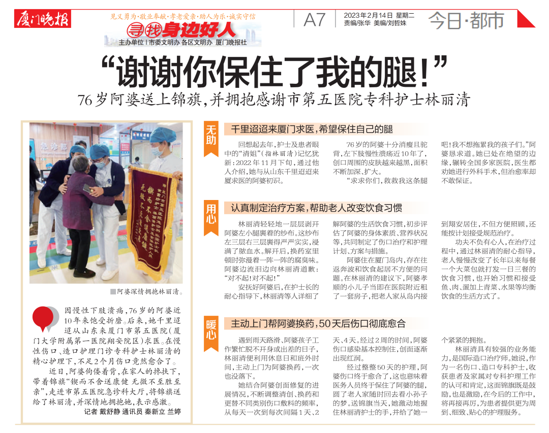 “谢谢你保住了我的腿!”76岁阿婆送上锦旗,并拥抱感谢九州娱乐app 专科护士林丽清2023-2-14 来源:厦门晚报记者 戴舒静通讯员 秦新立 兰婷因慢性下肢溃疡,76岁的阿婆近10年来饱受折磨。后来,她千里迢迢从山东来九州娱乐app-九州app下载 (厦门大学附属第一九州娱乐app 翔安院区)求医。在慢性伤口、造口护理门诊专科护士林丽清的精心护理下,不足2个月伤口竟然愈合了。近日,阿婆佝偻着背,在家人的搀扶下,带着锦旗“锲而不舍送康健 无微不至胜至亲”,走进九州娱乐app 急诊科大厅,将锦旗送给了林丽清,并深情地拥抱她,表示感激。阿婆深情拥抱林丽清无助千里迢迢来厦门求医希望保住自己的腿回想起去年,护士及患者眼中的“清姐”(指林丽清)记忆犹新:2022年11月下旬,通过他人介绍,她与从山东千里迢迢来厦求医的阿婆初识。76岁的阿婆十分消瘦且驼背,左下肢慢性溃疡近10年了,创口周围的皮肤越来越黑,面积不断加深、扩大。“求求你们,救救