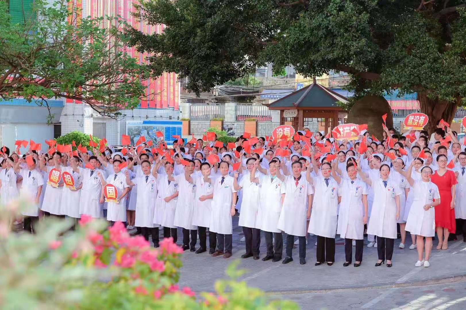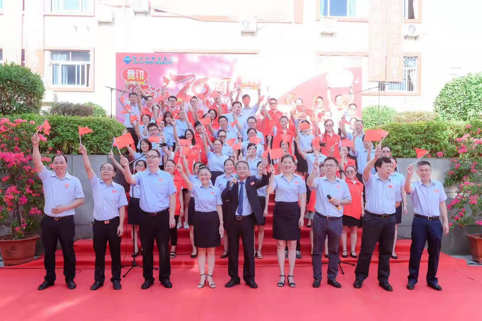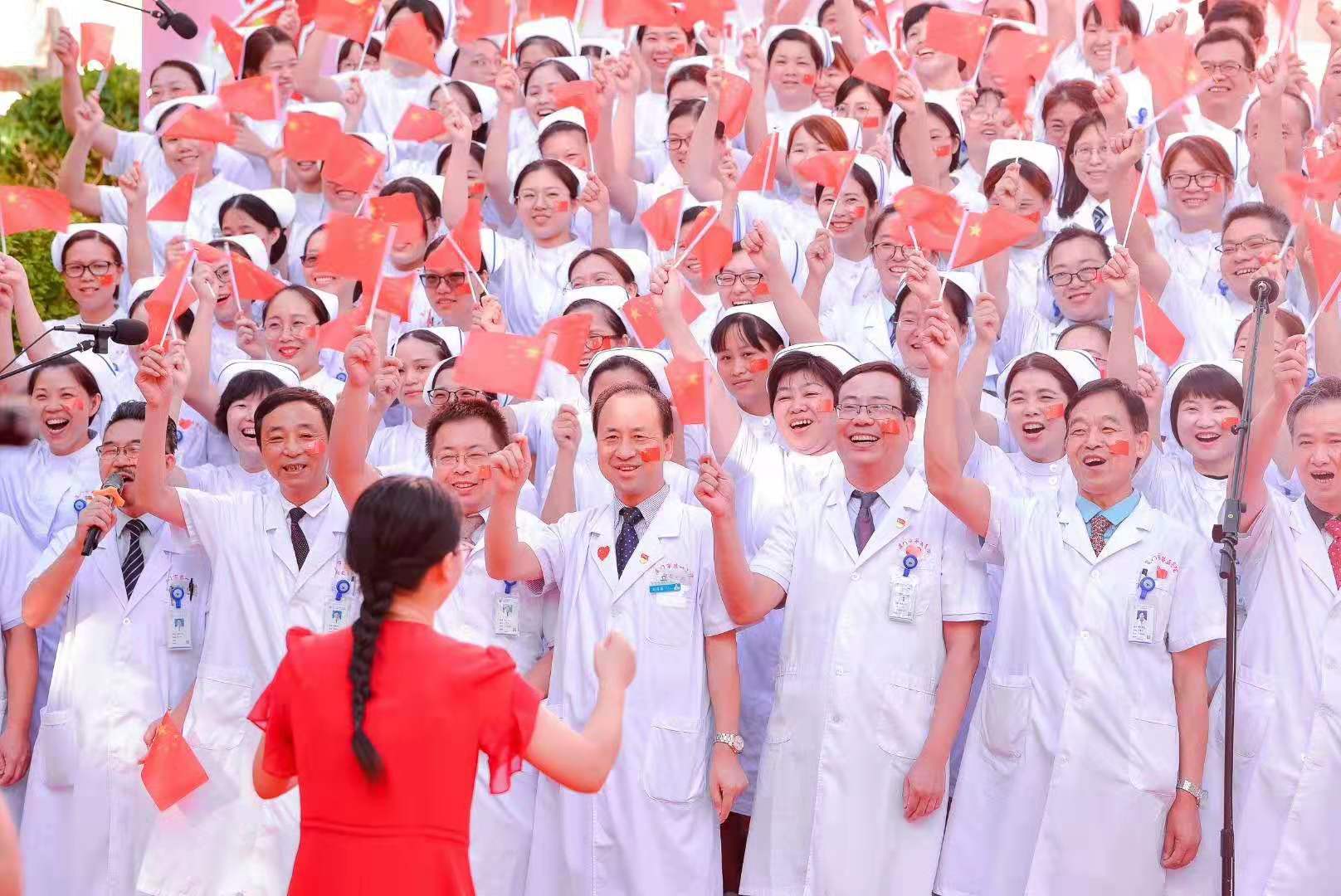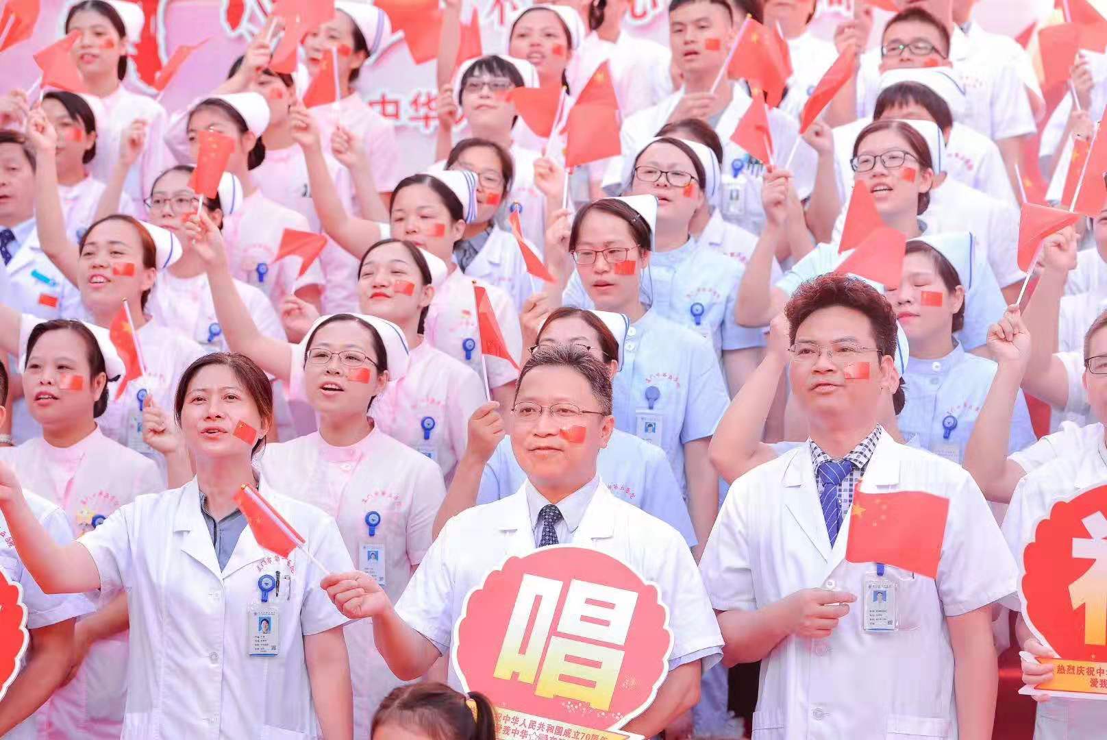 9月30日上午,九州娱乐app-九州app下载 举行庆祝中华人民共和国成立70周年主题活动。现场举行了庄严的升国旗仪式,党委书记丁丽远同志带领全体医务人员高唱国歌。升旗仪式后,黄继义院长做了国旗下讲话,对全院职工进行爱国主义教育。随后,全体五院职工唱响《我的中国心》、《我们走在大路上》、 《团结就是力量》、 《中国人》、《没有共产党就没有新中国》、《歌唱祖国》等红歌,共祝祖国70年华诞。最后,九州娱乐app 全体党政领导班子和医联体成员共同高歌《我和我的祖国》,将主题活动推向高潮。